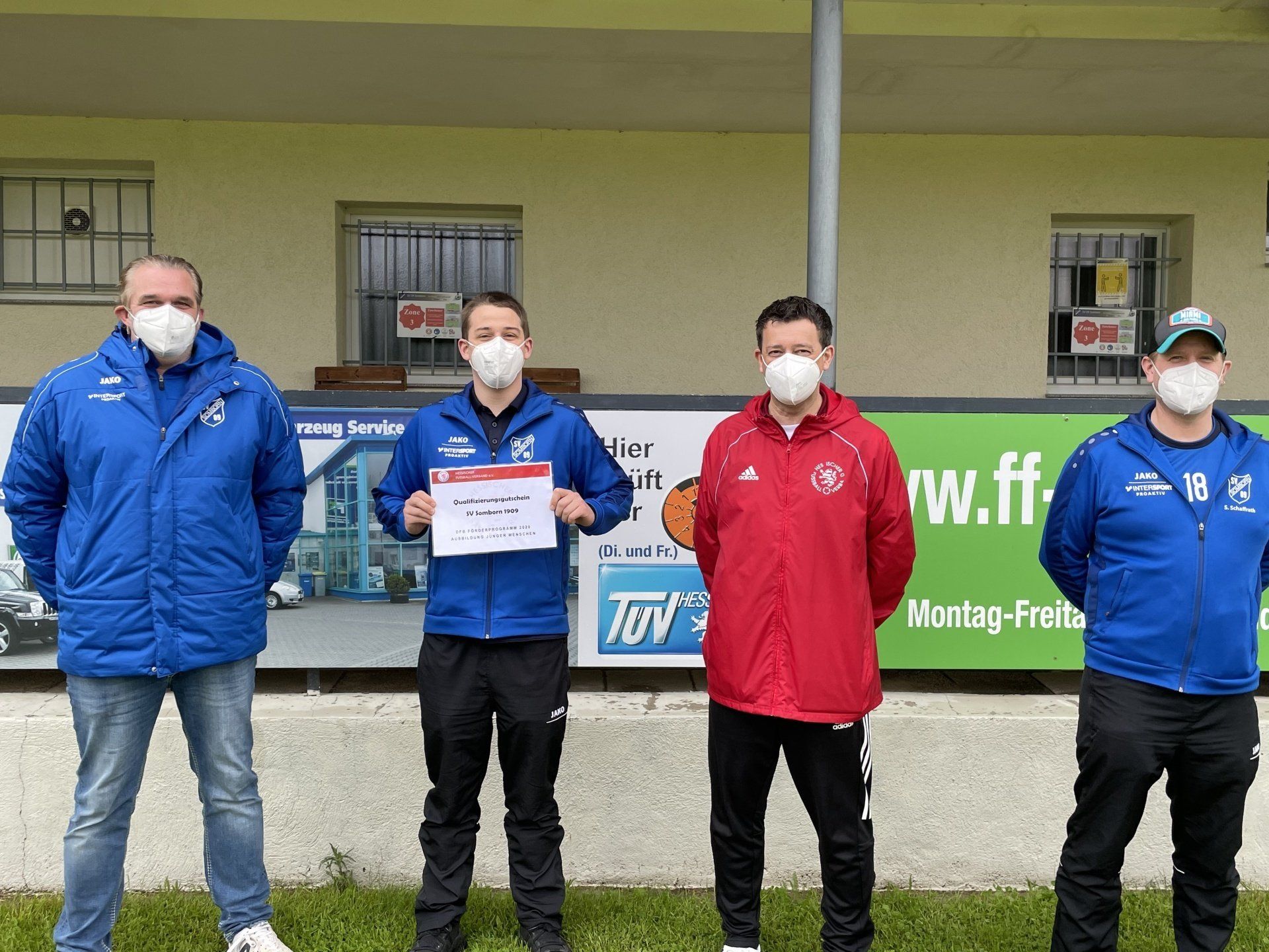 Für die ausgezeichnete Ausbildung junger Menschen im Rahmen der Trainerausbildung übergibt Frank Illing (Vorsitzender des Verbandsausschusses für Qualifizierung und Vereinsentwicklung) Fördermittel des DFB an den SV09 Somborn. In den vergangenen Jahren hat der SV09 viele Trainer ausgebildet und auch einen großen Anteil an ehrenamtlichen Trainern unter 25 Jahren. So haben von den 29 Trainern des SV09 Somborn mittlerweile 16 die DFB C- oder B-Lizenz. 3 weitere sind zur Zeit in Ausbildung zur C-Lizenz.