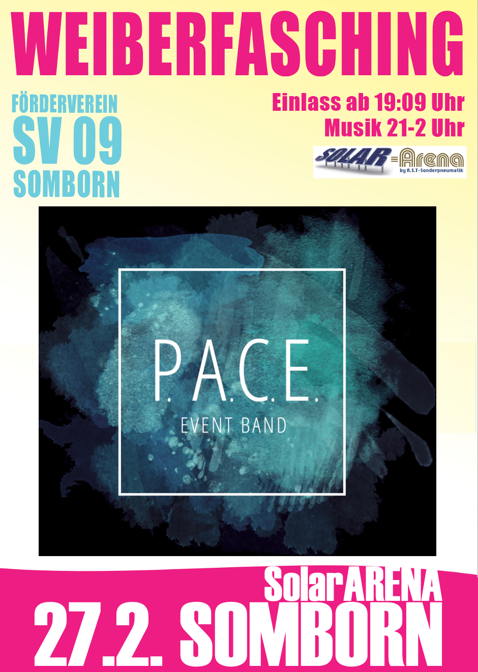 Am 27.Februar steigt in der SolarARENA der Schwarz-Blaue Weiberfasching mit neuer Band. Die Eventband P.A.C.E. wird uns die Party bringen. Alle weiteren Informationen folgen.
